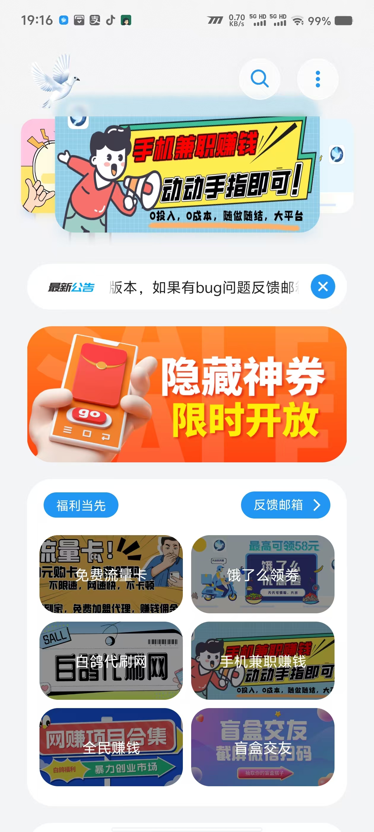 白鸽软件盒可以为广大用户带来高质量的丰富应用资源,这里无论是自制游戏、魔改游戏还是冷门少见的学习资料实用工具都应有尽有,全部资源免费提供为爱发电,用户可以放心下载直装,首页还有免费流量卡、饿了么领券等福利礼包等你来领取。